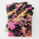 These wrapping paper sheets have an abstract pattern with different colors. One sheet has a pink orange color theme, another has a yellow golden color theme, and the third one has a orange redish-pink color theme.