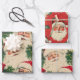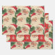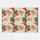 Ce papier d'emballage de style vintage présente un motif répétitif de visages classiques du Père Noël. Chaque Père Noël possède un casquette rouge et une barbe blanche, avec des joues roses et une expression joyeuse. Les Santas sont parsemés de pins verts, apportant une touche de verdure festive à l'ensemble. L'arrière - plan a un aspect texturé, légèrement vieilli, lui donnant une sensation nostalgique.