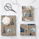 Un ensemble de papier d'emballage de Noël Kraft trio avec des épinettes bleues boisées à l'aquarelle avec des ornements bleu épicéa, un renard blanc arctique et un renne dans un motif répétitif.