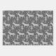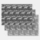 Un élégant papier d'emballage neutre de vacances avec des motifs d'épicéa argenté et de rennes de cerf, enneigés sur trois nuances de gris foncé.