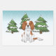 Illustration originale de Destei d'un mignon chien de race Cavalier couleur blenheim. Le chien est placé dans une scène hivernale. Dans la scène il neige dans l'arrière - plan et il y a trois sapins verts derrière le chien. Les arbres ont de la neige sur eux. L'arrière - plan est un dégradé bleu clair à blanc donnant à ce design froid froid d'hiver look.