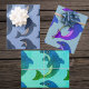 Cet ensemble de feuilles de papier d'emballage ont des rangées de dauphins de saut mignons dans différentes combinaisons de couleurs de Blues, violets et verts sur les arrière - plans correspondants.