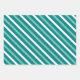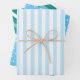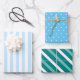 Un trio frais et amusant de feuilles de papier d'emballage dans différentes nuances de bleu et turquoise avec des rayures blanches et pois. Cette combinaison élégante est parfaite pour envelopper les cadeaux d'anniversaire et/ou de vacances pour vos amis et votre famille. Les couleurs bleu et turquoise sont à l'honneur pour petits et grands.