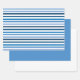 Ce jeu de papier d'emballage comporte un motif à bandes bleues multicolores sur la première feuille, la feuille deux coordonnées avec un bleu solide et la feuille trois est blanche solide.