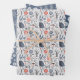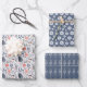 Un ensemble coordonné de draps d'enveloppement cadeau avec un art folklorique nordique se sent dans le blues et le rouge.