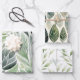 Ces feuilles de papier d'emballage présentent trois motifs d'aquarelle boho coordonnés de feuilles et de feuillage dans les tons vert sauge.