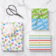 Boules de Noël colorées motif, rayures et le nom de famille feuille de papier enveloppant. Une feuille affiche un joli motif de boules de Noël colorées et de cadeaux. Le deuxième présente des bandes en rouge, vert, bleu clair et jaune et votre nom de famille en caractères gras et le troisième présente des bandes rouge, vert, bleu et jaune. Veuillez noter que si votre nom prend plus ou moins d'espace, customisez-le pour augmenter ou diminuer la taille du texte en conséquence.