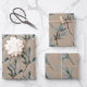 Un ensemble de trois feuilles de papier d'emballage de Noël Kraft avec des épinettes peintes à l'aquarelle dans un motif répétitif.