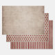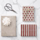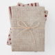 Papier d'emballage de trois feuilles en coordonnant le burlap rustique et le bordeaux. La feuille 1 est un burlap brun solide, la feuille 2 est un motif à pois bordeaux sur burlap, et la feuille 3 est un motif à rayures bordeaux sur burlap. Contactez-nous pour obtenir de l'aide sur la personnalisation ou pour demander des produits correspondants ou coordonnés.