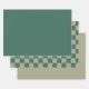 Une feuille d'emballage a un motif de damier. La feuille d'emballage verte de la forêt est une couleur solide. La feuille d'emballage à la sauge est également une couleur solide.