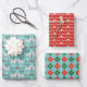 Feuille de papier enveloppant avec trois motifs de Noël assortis : chevaux Dala suédois en blanc avec verdure, fleurs et coeurs; fleurs rouges et blanches; et plaid vert, rouge, bleu et blanc.