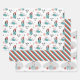 Chiens de caricature de Noël Whimsical. Trois motifs de Noël différents. Un motif avec un dessin animé sautant et un chien debout portant un pull bleu et des cadeaux rouges et casquettes enveloppés de rouge, des étoiles et des arbres gribouillants et les mots Ho Ho Ho. Un motif rayé en bleu, rouge et blanc. Un motif mod du 3ème siècle avec un chien debout sur un emballage cadeau emballé avec un arrière - plan gris avec des étoiles.