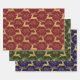This design features a repeating pattern of stylized golden reindeer with large, ornate antlers, shown in a leaping or running posture, set against a rich, textured leather, deep red, green and navy background. Interspersed between the reindeer are swirling, decorative golden motifs that enhance the luxurious, festive feel. The overall appearance suggests an elegant and traditional aesthetic, making it an excellent design choice for Christmas wrapping paper and decor.