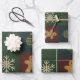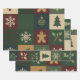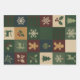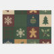 Vintage-charm wrapping paper featuring a cozy patchwork of Christmas squares—trees, snowflakes, reindeer, holly, gingerbread, and ornaments—set in classic green, cream, burgundy, navy, and gold accents.