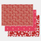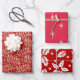 Christmas wrapping paper multi-pack that includes: 1) Gold Merry Christmas on red background, 2) Gold stars on red background, 3) White winter foliage on red back ground.