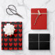 Un ensemble de trois papiers d'emballage décoratifs de 19x29" : une feuille à motifs avec un motif de coeur de Saint-Valentin rouge vif sur un arrière - plan noir à jet solide et sophistiqué, et des feuilles noires à jet et rouge valentin solides pour une collection de cadeaux sophistiquée, et do-it-yourself projets artisanaux
