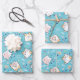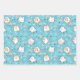 Envelopper des feuilles de papier avec un motif chaton mignon, posé sur un arrière - plan bleu et décoré avec des arcs-en-ciel et des empreintes de pattes et plus encore.