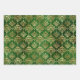 Elégante collection de papier d'emballage vert 3 feuilles avec damas vintage or sur la feuille 1, un motif de rennes d'or sur la feuille 2, et des flocons d'or glittery sur la feuille 3.