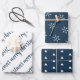 Un élégant ensemble de trois feuilles de papier d'emballage coordonnés dans une palette de couleurs bleu et ivoire profonde. On a Joyeux Noël écrit dans une police manuscrite moderne. Le deuxième est doté d'un motif abstrait de sapin de Noël et le troisième d'un motif de flocon de neige.