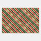 Des rayures élégantes en or vif, rouge et vert grace la première feuille de ce jeu de 3 feuilles de papier d'emballage pour l'emballage cadeau de Noël. Leurs imperfections classieuses reflètent leur merveilleuse origine vintage. Accompagnant celui-ci est une deuxième feuille dans un grand rouge massif saisonnier, et la troisième feuille est le vert de vacances contrasté. Le trio fait un regroupement agréable pour vos projets de cadeaux.