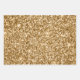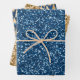Elégante collection de papier d'emballage de Noël de 3 feuilles avec une feuille de parties scintillant bleue, une feuille de parties scintillant d'or, et une feuille avec des arbres de Noël d'or modelée sur un arrière - plan bleu métallique.