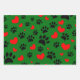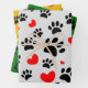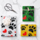 Dessins d'empreintes de pattes de chiens et de coeurs rouges dans de nombreuses tailles. Papier d'emballage personnalisé avec arrière - plan vert, blanc et or. Idée envelopper cadeau pour les personnes de tous âges qui aiment les chiens.