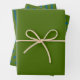Papier d'emballage à trois feuilles en coordonnant les couleurs vert et bleu. La feuille 1 est une couleur solide, la feuille 2 est un motif à points de polka et la feuille 3 est un motif rayé. Contactez-nous pour obtenir de l'aide sur la personnalisation ou pour demander des produits correspondants ou coordonnés.