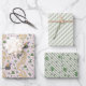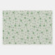 Adorable ensemble de 3 feuilles individuelles de papier d'enveloppement de la Saint Patrick, dessiné à la main par Nathalie Portet à l'encre noire. Feuille #1 : Présente un design fantaisiste de pièces d'or dans un motif curieux, des pots d'or sous les arc-en-ciel, des trèfles verts, des chaussures de cheval, des casquettes leprechaun, des coeurs verts, de minuscules champignons verts et un souhait de chance. Feuille #2 : Présente un motif en vichy rose et vert pastel. Feuille #3 : Présente des trèfles et des textes "chanceux" contre un motif festif rayé rose et vert.