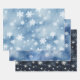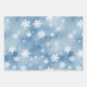 Des flocons de neige blancs et argentés tombent sur un ciel bleu dans cette peinture d'aquarelle d'hiver vintage du pays des merveilles juste pour votre élégant papier d'emballage de Noël. Chacune des trois conceptions diffère un peu plus particulièrement dans le ton ciel : du bleu clair au bleu foncé épais avec quelques nuages comme accents.