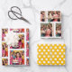 A fun surprise birthday party gift wrap sheets. Each has a different illustration. Two are differnet illustrations of a group of retro mid-century friends gathering to surprise someone for their birthday holding a cake. Another is yellow with white polka dots.
