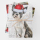 Ce chien irrésistible Boston Terrier est prêt pour la saison des Fêtes avec un chapeau de Père Noël, associé à un tartan rouge et vert festif de Noël plaid sur cet ensemble de enveloppement cadeau pour l'amoureux des chiens.