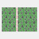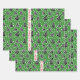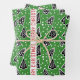 Vert moderne abstrait Joyeux Noël arbres vacances Enveloppement Feuilles de papier. Il affiche un joli motif d'arbres stylisés de Noël noir et blanc sur le vert et le texte vertical "Joyeux Noël" sur une bande blanche.