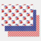 Célébrez le Jour de l'Indépendance avec ces feuilles de papier d'emballage colorées dans trois modèles patriotiques : (1) un motif de bouquets floraux rouges, blancs et bleus sur un arrière - plan blanc, (2) un motif étoilé blanc sur un arrière - plan bleu, et (3) bandes diagonales rouges et blanches. Idéal également pour un anniversaire ou un baby shower sur le thème du 4 juillet.