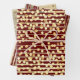 Un trio d'enveloppement cadeau, chacun avec un design différent mais le tout en or et une couleur rouge vin de Bourgogne profonde. La première feuille comporte de fines lignes horizontales sur lesquelles apparaissent des points de confettis dorés; la seconde a une bande verticale épaisse et fine entre laquelle est une fine bande verticale avec des perles et la troisième a des bandes horizontales minces qui filent à travers des cercles d'or de taille moyenne en or ancien. La couleur arrière - plan peut être changée selon votre choix.