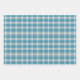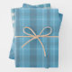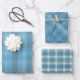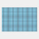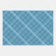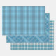 Ensemble de trois feuilles de papier d'emballage. Chaque feuille comporte un motif plaid différent dans les tons bleu et gris.