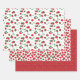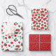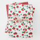 Feuilles de papier d'emballage à thème fraise avec trois motifs de fraise assortis : une feuille avec des fraises rouges, des feuilles et des fleurs blanches, une feuille avec beaucoup de fraises et une feuille rouge avec de petites graines de fraise. Papier d'emballage parfait pour les anniversaires à thème fraise, les baby showers à thème fraise et les douches de mariée à thème fraise.