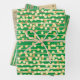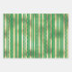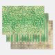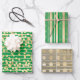 Un trio de enveloppement cadeau, chacun avec un design différent mais tout en or et un vert pomme plein de vie. La première feuille comporte de fines lignes horizontales sur lesquelles apparaissent des points de confettis dorés; la seconde a une bande verticale épaisse et fine entre laquelle est une fine bande verticale avec des perles et la troisième a des bandes horizontales minces qui filent à travers des cercles d'or de taille moyenne en or ancien. La couleur arrière - plan peut être changée selon votre choix.