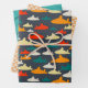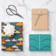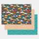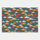 Papier d'emballage motif de requin simple mais doux en turquoise, rouge, orange, jaune et gris. Comprend la coordination du motif à l'échelle de poisson et du motif à vague.