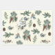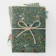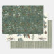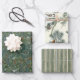 Un emballage pour les amoureux de la nature. La première feuille de papier d'emballage est un collage de branches à feuillage persistant denses qui comprend des aiguilles de pin, d'épinette, d'if, de sapin et de genévrier. Le deuxième papier est entrecoupé de branches à feuillage persistant et de pinécones, avec un oiseau-chanteur de poule perché sur une branche enneigée. Enfin, le troisième document a des rayures vertes vintages.