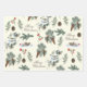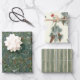 Un emballage pour les amoureux de la nature. La première feuille de papier d'emballage est un collage de branches à feuillage persistant denses qui comprend des aiguilles de pin, d'épinette, d'if, de sapin et de genévrier. Sur le deuxième article, "Joyeux Noël" est entrecoupé de branches à feuillage persistant et de pinécones, avec un oiseau-chanteur de poule perché sur une branche enneigée. Enfin, le troisième document a des rayures vertes vintages.