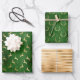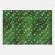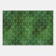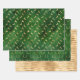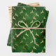 Cet assortiment de papier d'emballage de vacances est composé de motifs de bois de faux feuille d'or et de cerfs sauteurs sur des arrière - plans en détresse verts, ainsi que d'un motif de bande satinée de faux feuille d'or.