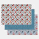 Ensemble de trois feuilles de papier enveloppant de Noël en couleurs coordonnées. La première feuille contient des cardinaux assis sur des branches de baies avec un arrière - plan bleu. La deuxième feuille est un bleu marine solide à assortir. Enfin, le troisième drap contient des fleurs d'aquarelle, des feuilles et des baies à l'ambiance festive.