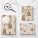 Un ensemble coordonné d'arbres de Noël en or et de flocons de neige sur une planche en bois arrière - plans draps cadeaux.