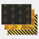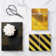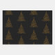 Ce papier d'emballage de Noël doré et noir présente un motif d'arbres de Noël métalliques dorés sur le noir sur la première feuille, un motif tourbillon doré très coloré sur la deuxième feuille, et en accord avec le thème noir et or, un motif rayé doré et noir sur la troisième feuille. Tous les draps ajouteront une touche très élégante, sophistiquée mais festive à votre emballage cadeau de vacances en décembre.