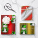 Collection mignonne et colorée de papier d'emballage de Noël en vert et rouge, les motif comprennent de mignons bonhomme de neige habillé en vert sur un arrière - plan rouge métallique, des bonhomme de neige plus vert sur un arrière - plan or, et un motif rayé en diagonale de rouge, vert et blanc.