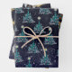 Cet ensemble de 3 grandes feuilles de papier semi-brillantes haut de gamme, chacune avec différents motifs de Noël, est liée avec un thème commun d'être mis contre un ciel étoilé bleu nuit. Une feuille présente un arbre de Noël à branches arrondies blanches et turquoise brillant avec des ornements violets ; un autre est un magnifique faux cloisonné 19ème siècle Anges russes ; et dernier est un ensemble d'étoiles dorées élégantes.