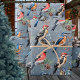 Un beau papier d'emballage de vacances à l'aquarelle, avec un motif répétitif du pic à ventre rouge, du bleuet oriental et du taureau à poitrine rouge, sur un arrière - plan gris bleu poussiéreux avec un dépoussiérage de la première chute de neige de l'hiver.