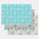 Trois feuilles de papier d'emballage dans un thème coordonné bleu, jaune et rose été/plage. La feuille 1 est bleue avec des coquillages blancs. La feuille 2 présente des flamants roses et des parasols en toile bleue. La feuille 3 a des coquillages bleus/turquoises et roses. Contactez-moi pour obtenir de l'aide sur la personnalisation ou pour demander des produits correspondants ou coordonnés.