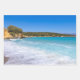 Envelopper des feuilles de papier avec une photo d'une plage sur l'île grecque de Crète. Une belle plage tropicale bleue au surf mousse. Merveilleuse destination de voyage tranquille.