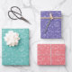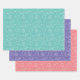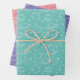 Papier d'emballage à thème spatial mignon avec un motif de planètes blanches, d'astéroïdes et d'étoiles sur un beau arrière - plan turquoise, violet et rose. Trois draps plats pour votre emballage cadeau. Illustré et dessiné par Patricia Alvarez.